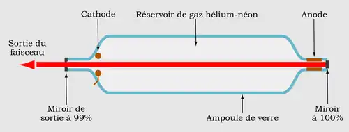 Le milieu amplificateur est un mélange de gaz néon et hélium, dans une proportion variant de 1/5 à 1/20, enfermé à basse pression (en moyenne 50 Pa par centimètre de longueur de la cavité[2]) dans une ampoule de verre. La source d'énergie du laser (ou « source de pompage ») est une décharge électrique de l'ordre du kilovolt appliquée à l'anode et à la cathode situées de part et d'autre du tube de verre. Dans le cas d'une émission continue on utilise le plus souvent un courant de 5 à 100 mA[3]. La cavité optique du laser est ordinairement constituée d'un miroir à haut pouvoir réfléchissant d'un côté du tube, et d'un miroir concave (output coupler) avec un indice de transmission d'environ 1 % de l'autre côté.
