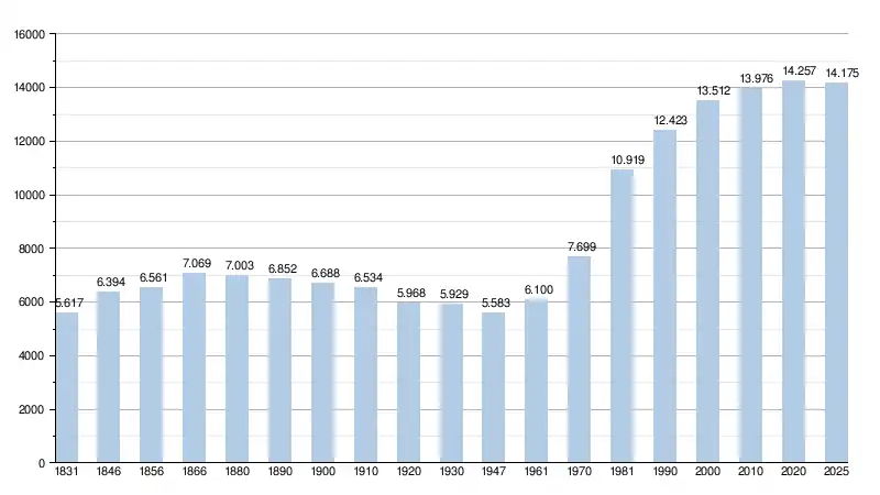 Les chiffres des années 1831 à 1970 tiennent compte des chiffres des anciennes communes fusionnées.