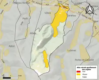 Les mouvements de terrains susceptibles de se produire sur la commune sont soit des chutes de blocs, soit des glissements de terrains, soit des mouvements liés au retrait-gonflement des argiles. Près de 50 % de la superficie du département est concernée par l'aléa retrait-gonflement des argiles, dont la commune de Lassur[39]. L'inventaire national des cavités souterraines permet par ailleurs de localiser celles situées sur la commune[40].