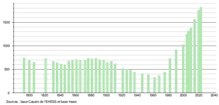 L'évolution du nombre d'habitants est connue à travers les recensements de la population effectués dans la commune depuis 1793. Pour les communes de moins de 10 000 habitants, une enquête de recensement portant sur toute la population est réalisée tous les cinq ans, les populations de référence des années intermédiaires étant quant à elles estimées par interpolation ou extrapolation[23]. Pour la commune, le premier recensement exhaustif entrant dans le cadre du nouveau dispositif a été réalisé en 2004[24].