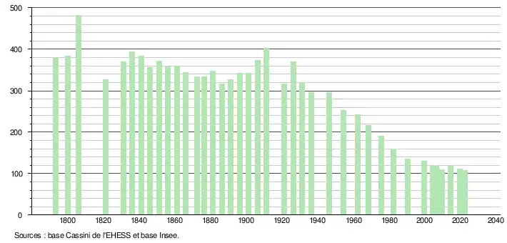 L'évolution du nombre d'habitants est connue à travers les recensements de la population effectués dans la commune depuis 1793. Pour les communes de moins de 10 000 habitants, une enquête de recensement portant sur toute la population est réalisée tous les cinq ans, les populations de référence des années intermédiaires étant quant à elles estimées par interpolation ou extrapolation[12]. Pour la commune, le premier recensement exhaustif entrant dans le cadre du nouveau dispositif a été réalisé en 2004[13].