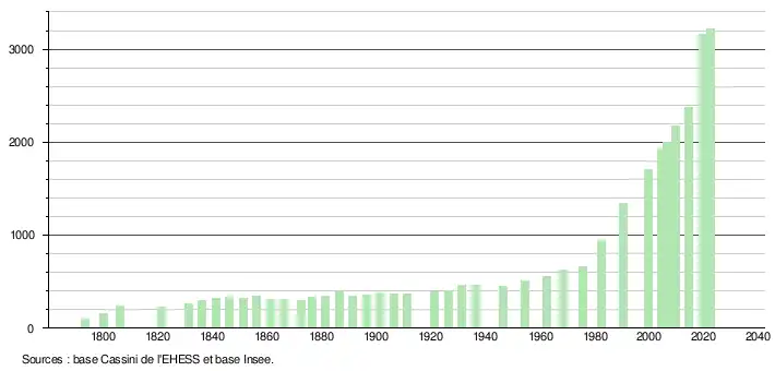 L'évolution du nombre d'habitants est connue à travers les recensements de la population effectués dans la commune depuis 1793. Pour les communes de moins de 10 000 habitants, une enquête de recensement portant sur toute la population est réalisée tous les cinq ans, les populations de référence des années intermédiaires étant quant à elles estimées par interpolation ou extrapolation[32]. Pour la commune, le premier recensement exhaustif entrant dans le cadre du nouveau dispositif a été réalisé en 2004[33].