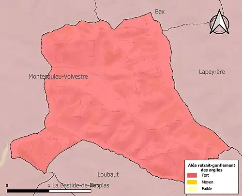 Le retrait-gonflement des sols argileux est susceptible d'engendrer des dommages importants aux bâtiments en cas d’alternance de périodes de sécheresse et de pluie. La totalité de la commune est en aléa moyen ou fort (88,8 % au niveau départemental et 48,5 % au niveau national). Sur les 39 bâtiments dénombrés sur la commune en 2019, 39 sont en aléa moyen ou fort, soit 100 %, à comparer aux 98 % au niveau départemental et 54 % au niveau national. Une cartographie de l'exposition du territoire national au retrait gonflement des sols argileux est disponible sur le site du BRGM[20],[Carte 3].