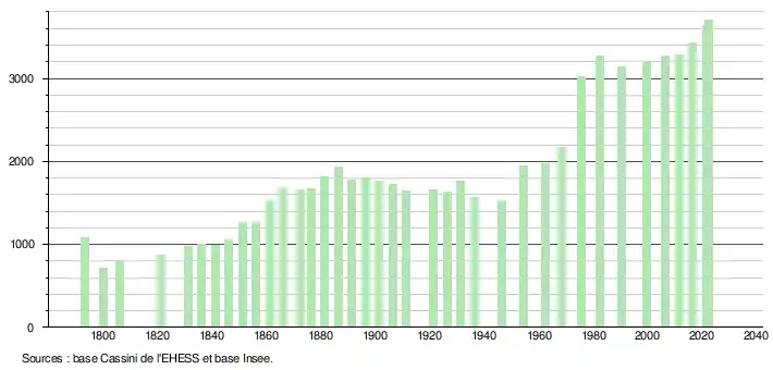 L'évolution du nombre d'habitants est connue à travers les recensements de la population effectués dans la commune depuis 1793. Pour les communes de moins de 10 000 habitants, une enquête de recensement portant sur toute la population est réalisée tous les cinq ans, les populations de référence des années intermédiaires étant quant à elles estimées par interpolation ou extrapolation[25]. Pour la commune, le premier recensement exhaustif entrant dans le cadre du nouveau dispositif a été réalisé en 2006[26].