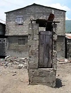 - une fosse, dans le cas d'une latrine sèche, ou un système d'évacuation des excréments ; la fosse peut être renforcée ou non, en béton ou en maçonnerie ;