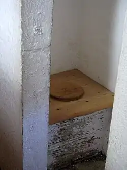 Dans les châteaux-forts[16] ou certaines maisons à plusieurs étages[17], les latrines sont installées dans une minuscule pièce d'étage, formant une excroissance sur la façade qu'on peut parfois confondre avec un dispositif de défense (mâchicoulis). Les excréments sont ainsi évacués directement à l'extérieur et tombent en contrebas ou bien sont récupérées dans des fosses ventilées.