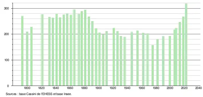 L'évolution du nombre d'habitants est connue à travers les recensements de la population effectués dans la commune depuis 1793. Pour les communes de moins de 10 000 habitants, une enquête de recensement portant sur toute la population est réalisée tous les cinq ans, les populations de référence des années intermédiaires étant quant à elles estimées par interpolation ou extrapolation[30]. Pour la commune, le premier recensement exhaustif entrant dans le cadre du nouveau dispositif a été réalisé en 2008[31].