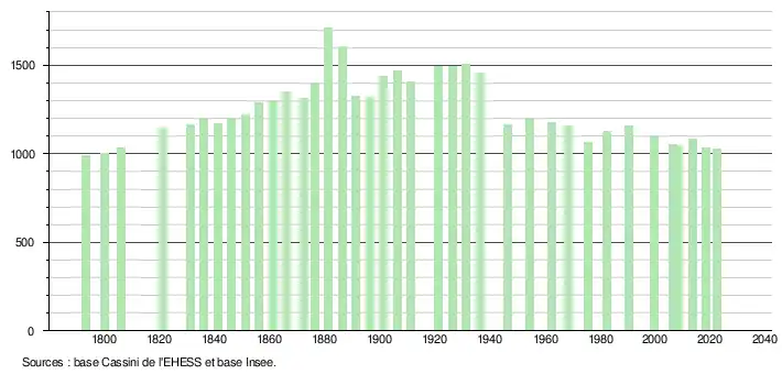 | L'évolution du nombre d'habitants est connue à travers les recensements de la population effectués dans la commune depuis 1793. Pour les communes de moins de 10 000 habitants, une enquête de recensement portant sur toute la population est réalisée tous les cinq ans, les populations de référence des années intermédiaires étant quant à elles estimées par interpolation ou extrapolation[27]. Pour la commune, le premier recensement exhaustif entrant dans le cadre du nouveau dispositif a été réalisé en 2008[28]. En 2022, la commune comptait 1 030 habitants[Note 3], en évolution de −4,1 % par rapport à 2016 (Aude : +2,65 %, France hors Mayotte : +2,11 %). |
