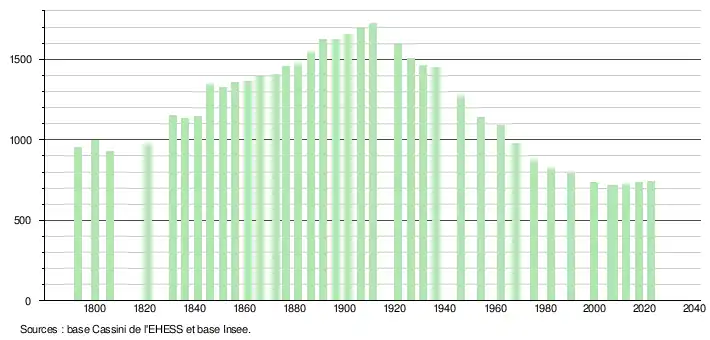 L'évolution du nombre d'habitants est connue à travers les recensements de la population effectués dans la commune depuis 1793. Pour les communes de moins de 10 000 habitants, une enquête de recensement portant sur toute la population est réalisée tous les cinq ans, les populations de référence des années intermédiaires étant quant à elles estimées par interpolation ou extrapolation[31]. Pour la commune, le premier recensement exhaustif entrant dans le cadre du nouveau dispositif a été réalisé en 2007[32].