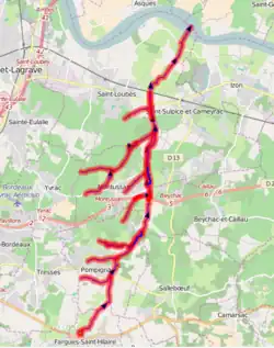 Elle passe sous la route départementale (RD) 241, au sud-est du bourg de Pompignac puis sert de limite sur huit kilomètres entre les communes qu'elle borde : à l'est, Beychac-et-Caillau et Saint-Sulpice-et-Cameyrac, et à l'ouest, Pompignac, Montussan et Saint-Loubès. Elle est franchie par la route nationale 89, reçoit en rive gauche son principal affluent, le ruisseau du Cournau, et passe successivement sous la RD 242 puis la ligne ferroviaire Bordeaux-Libourne.
