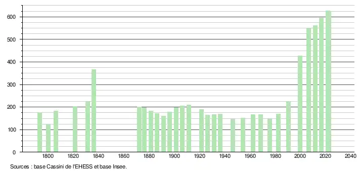 L'évolution du nombre d'habitants est connue à travers les recensements de la population effectués dans la commune depuis 1793. Pour les communes de moins de 10 000 habitants, une enquête de recensement portant sur toute la population est réalisée tous les cinq ans, les populations de référence des années intermédiaires étant quant à elles estimées par interpolation ou extrapolation[26]. Pour la commune, le premier recensement exhaustif entrant dans le cadre du nouveau dispositif a été réalisé en 2006[27].