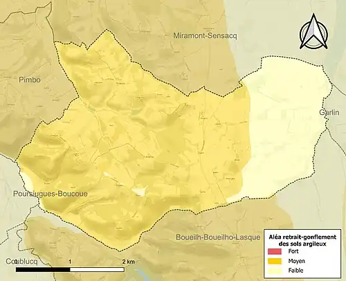 Le retrait-gonflement des sols argileux est susceptible d'engendrer des dommages importants aux bâtiments en cas d’alternance de périodes de sécheresse et de pluie. 76,1 % de la superficie communale est en aléa moyen ou fort (19,2 % au niveau départemental et 48,5 % au niveau national). Sur les 48 bâtiments dénombrés sur la commune en 2019, 48 sont en aléa moyen ou fort, soit 100 %, à comparer aux 17 % au niveau départemental et 54 % au niveau national. Une cartographie de l'exposition du territoire national au retrait gonflement des sols argileux est disponible sur le site du BRGM[18],[Carte 2].