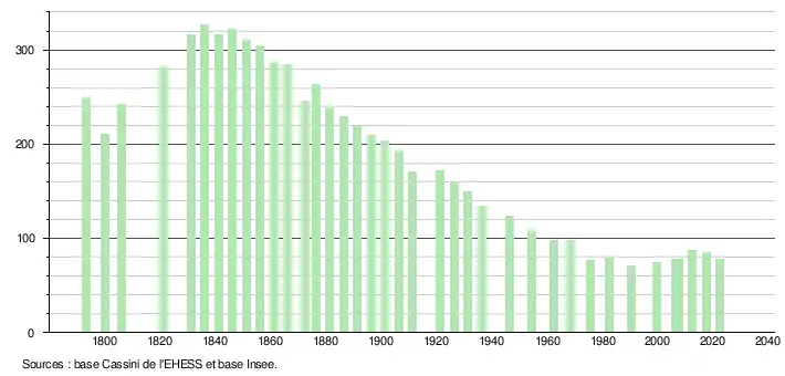 | L'évolution du nombre d'habitants est connue à travers les recensements de la population effectués dans la commune depuis 1793. Pour les communes de moins de 10 000 habitants, une enquête de recensement portant sur toute la population est réalisée tous les cinq ans, les populations de référence des années intermédiaires étant quant à elles estimées par interpolation ou extrapolation[19]. Pour la commune, le premier recensement exhaustif entrant dans le cadre du nouveau dispositif a été réalisé en 2007[20]. En 2022, la commune comptait 78 habitants[Note 1], en évolution de −10,34 % par rapport à 2016 (Landes : +5,78 %, France hors Mayotte : +2,11 %). |