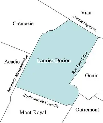La circonscription de Laurier-Dorion est située dans la ville de Montréal. Elle comprend la partie de l'arrondissement Villeray–Saint-Michel–Parc-Extension située au sud-ouest de l'avenue Papineau. Ses limites sud-ouest, nord-ouest et sud-est sont donc les mêmes que celle de l'arrondissement, soit respectivement : le boulevard de l'Acadie, l'Autoroute métropolitaine et la rue Jean-Talon prolongée par le chemin de fer[5].