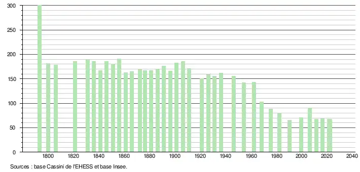 L'évolution du nombre d'habitants est connue à travers les recensements de la population effectués dans la commune depuis 1793. Pour les communes de moins de 10 000 habitants, une enquête de recensement portant sur toute la population est réalisée tous les cinq ans, les populations de référence des années intermédiaires étant quant à elles estimées par interpolation ou extrapolation[24]. Pour la commune, le premier recensement exhaustif entrant dans le cadre du nouveau dispositif a été réalisé en 2006[25].