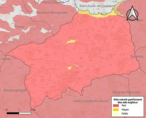 Le retrait-gonflement des sols argileux est susceptible d'engendrer des dommages importants aux bâtiments en cas d’alternance de périodes de sécheresse et de pluie[18]. La totalité de la commune est en aléa moyen ou fort (91,8 % au niveau départemental et 48,5 % au niveau national)[Carte 2]. Depuis le , en application de la loi ELAN, différentes contraintes s'imposent aux vendeurs, maîtres d'ouvrages ou constructeurs de biens situés dans une zone classée en aléa moyen ou fort[Note 1],[19].