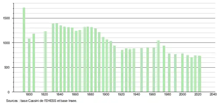 L'évolution du nombre d'habitants est connue à travers les recensements de la population effectués dans la commune depuis 1793. Pour les communes de moins de 10 000 habitants, une enquête de recensement portant sur toute la population est réalisée tous les cinq ans, les populations de référence des années intermédiaires étant quant à elles estimées par interpolation ou extrapolation[25]. Pour la commune, le premier recensement exhaustif entrant dans le cadre du nouveau dispositif a été réalisé en 2006[26].