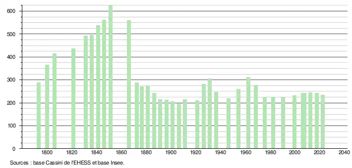 L'évolution du nombre d'habitants est connue à travers les recensements de la population effectués dans la commune depuis 1793. Pour les communes de moins de 10 000 habitants, une enquête de recensement portant sur toute la population est réalisée tous les cinq ans, les populations de référence des années intermédiaires étant quant à elles estimées par interpolation ou extrapolation[23]. Pour la commune, le premier recensement exhaustif entrant dans le cadre du nouveau dispositif a été réalisé en 2007[24].