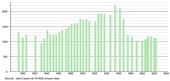 L'évolution du nombre d'habitants est connue à travers les recensements de la population effectués dans la commune depuis 1793. Pour les communes de moins de 10000habitants, une enquête de recensement portant sur toute la population est réalisée tous les cinqans, les populations de référence des années intermédiaires étant quant à elles estimées par interpolation ou extrapolation[23]. Pour la commune, le premier recensement exhaustif entrant dans le cadre du nouveau dispositif a été réalisé en 2004[24].