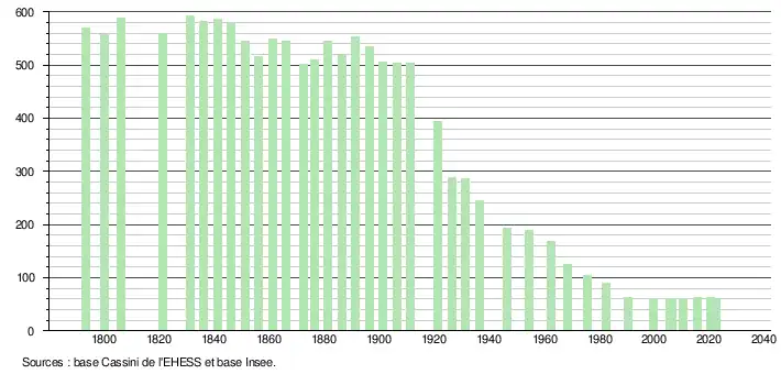 L'évolution du nombre d'habitants est connue à travers les recensements de la population effectués dans la commune depuis 1793. Pour les communes de moins de 10 000 habitants, une enquête de recensement portant sur toute la population est réalisée tous les cinq ans, les populations de référence des années intermédiaires étant quant à elles estimées par interpolation ou extrapolation[26]. Pour la commune, le premier recensement exhaustif entrant dans le cadre du nouveau dispositif a été réalisé en 2005[27].