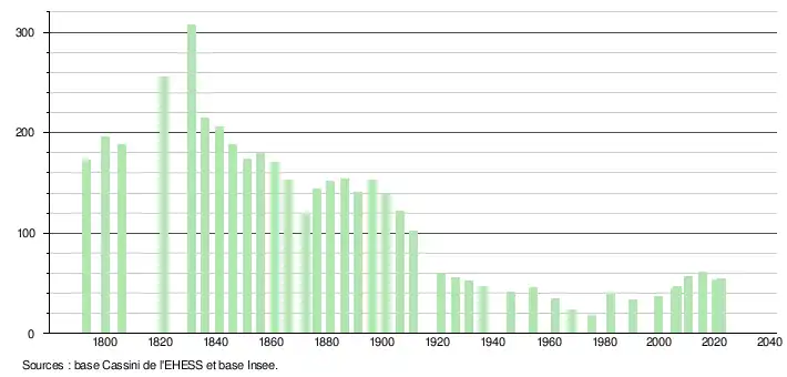 L'évolution du nombre d'habitants est connue à travers les recensements de la population effectués dans la commune depuis 1793. Pour les communes de moins de 10 000 habitants, une enquête de recensement portant sur toute la population est réalisée tous les cinq ans, les populations de référence des années intermédiaires étant quant à elles estimées par interpolation ou extrapolation[16]. Pour la commune, le premier recensement exhaustif entrant dans le cadre du nouveau dispositif a été réalisé en 2005[17].