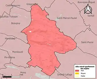 Le retrait-gonflement des sols argileux est susceptible d'engendrer des dommages importants aux bâtiments en cas d’alternance de périodes de sécheresse et de pluie. 99,8 % de la superficie communale est en aléa moyen ou fort (88,8 % au niveau départemental et 48,5 % au niveau national). Sur les 305 bâtiments dénombrés sur la commune en 2019, 304 sont en aléa moyen ou fort, soit 100 %, à comparer aux 98 % au niveau départemental et 54 % au niveau national. Une cartographie de l'exposition du territoire national au retrait gonflement des sols argileux est disponible sur le site du BRGM[22],[Carte 3].