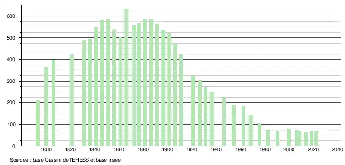 L'évolution du nombre d'habitants est connue à travers les recensements de la population effectués dans la commune depuis 1793. Pour les communes de moins de 10 000 habitants, une enquête de recensement portant sur toute la population est réalisée tous les cinq ans, les populations de référence des années intermédiaires étant quant à elles estimées par interpolation ou extrapolation[15]. Pour la commune, le premier recensement exhaustif entrant dans le cadre du nouveau dispositif a été réalisé en 2008[16].