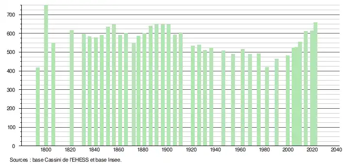 L'évolution du nombre d'habitants est connue à travers les recensements de la population effectués dans la commune depuis 1793. Pour les communes de moins de 10 000 habitants, une enquête de recensement portant sur toute la population est réalisée tous les cinq ans, les populations de référence des années intermédiaires étant quant à elles estimées par interpolation ou extrapolation[24]. Pour la commune, le premier recensement exhaustif entrant dans le cadre du nouveau dispositif a été réalisé en 2004[25].