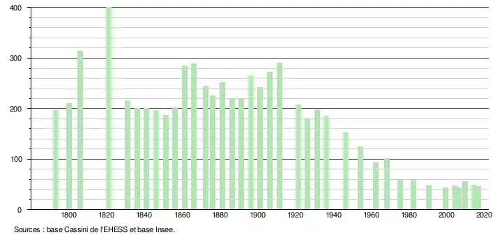 L'évolution du nombre d'habitants est connue à travers les recensements de la population effectués dans la commune depuis 1793. Pour les communes de moins de 10 000 habitants, une enquête de recensement portant sur toute la population est réalisée tous les cinq ans, les populations de référence des années intermédiaires étant quant à elles estimées par interpolation ou extrapolation[5]. Pour la commune, le premier recensement exhaustif entrant dans le cadre du nouveau dispositif a été réalisé en 2004[6].