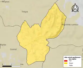 Le retrait-gonflement des sols argileux est susceptible d'engendrer des dommages importants aux bâtiments en cas d’alternance de périodes de sécheresse et de pluie. La totalité de la commune est en aléa moyen ou fort (67,7 % au niveau départemental et 48,5 % au niveau national). Sur les 239 bâtiments dénombrés sur la commune en 2019, 239 sont en aléa moyen ou fort, soit 100 %, à comparer aux 72 % au niveau départemental et 54 % au niveau national. Une cartographie de l'exposition du territoire national au retrait gonflement des sols argileux est disponible sur le site du BRGM[28],[Carte 2].