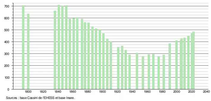 | L'évolution du nombre d'habitants est connue à travers les recensements de la population effectués dans la commune depuis 1793. Pour les communes de moins de 10 000 habitants, une enquête de recensement portant sur toute la population est réalisée tous les cinq ans, les populations de référence des années intermédiaires étant quant à elles estimées par interpolation ou extrapolation[32]. Pour la commune, le premier recensement exhaustif entrant dans le cadre du nouveau dispositif a été réalisé en 2005[33]. En 2022, la commune comptait 485 habitants[Note 3], en évolution de +8,26 % par rapport à 2016 (Lot : +1,31 %, France hors Mayotte : +2,11 %). |