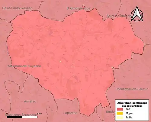 Le retrait-gonflement des sols argileux est susceptible d'engendrer des dommages importants aux bâtiments en cas d’alternance de périodes de sécheresse et de pluie[19]. La totalité de la commune est en aléa moyen ou fort (91,8 % au niveau départemental et 48,5 % au niveau national)[Carte 2]. Depuis le , en application de la loi ELAN, différentes contraintes s'imposent aux vendeurs, maîtres d'ouvrages ou constructeurs de biens situés dans une zone classée en aléa moyen ou fort[Note 2],[20].