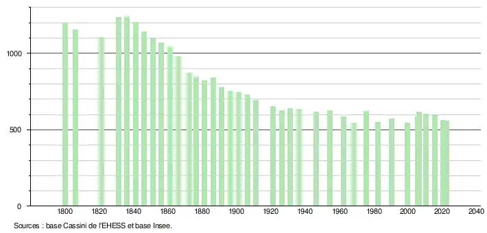 L'évolution du nombre d'habitants est connue à travers les recensements de la population effectués dans la commune depuis 1800. Pour les communes de moins de 10 000 habitants, une enquête de recensement portant sur toute la population est réalisée tous les cinq ans, les populations de référence des années intermédiaires étant quant à elles estimées par interpolation ou extrapolation[21]. Pour la commune, le premier recensement exhaustif entrant dans le cadre du nouveau dispositif a été réalisé en 2005[22].