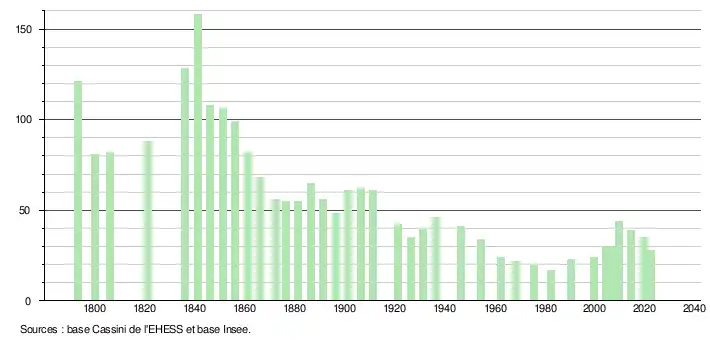 L'évolution du nombre d'habitants est connue à travers les recensements de la population effectués dans la commune depuis 1793. Pour les communes de moins de 10 000 habitants, une enquête de recensement portant sur toute la population est réalisée tous les cinq ans, les populations de référence des années intermédiaires étant quant à elles estimées par interpolation ou extrapolation[26]. Pour la commune, le premier recensement exhaustif entrant dans le cadre du nouveau dispositif a été réalisé en 2004[27].