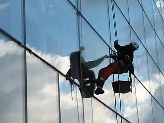 Des laveurs de carreaux sur une plateforme
