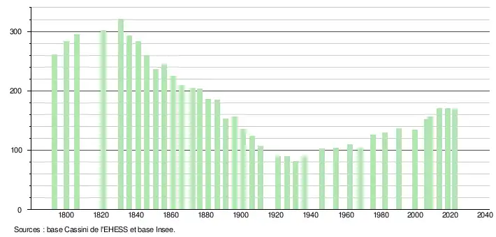 L'évolution du nombre d'habitants est connue à travers les recensements de la population effectués dans la commune depuis 1793. Pour les communes de moins de 10 000 habitants, une enquête de recensement portant sur toute la population est réalisée tous les cinq ans, les populations de référence des années intermédiaires étant quant à elles estimées par interpolation ou extrapolation[20]. Pour la commune, le premier recensement exhaustif entrant dans le cadre du nouveau dispositif a été réalisé en 2008[21].