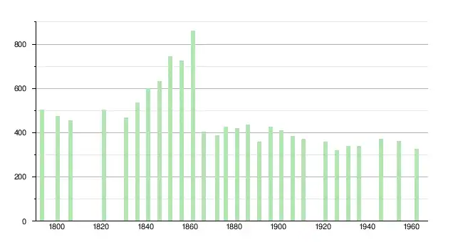 L'important chute démographique constatée en 1866 par rapport à 1861 (perte de plus de la moitié des habitants) peut s'expliquer par la cession en 1864 d'une partie du territoire à la commune voisine de Terrasson[1].