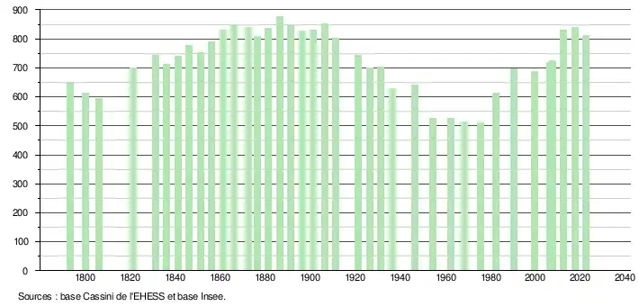L'évolution du nombre d'habitants est connue à travers les recensements de la population effectués dans la commune depuis 1793. Pour les communes de moins de 10 000 habitants, une enquête de recensement portant sur toute la population est réalisée tous les cinq ans, les populations de référence des années intermédiaires étant quant à elles estimées par interpolation ou extrapolation[26]. Pour la commune, le premier recensement exhaustif entrant dans le cadre du nouveau dispositif a été réalisé en 2007[27].