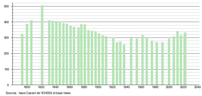 L'évolution du nombre d'habitants est connue à travers les recensements de la population effectués dans la commune depuis 1793. Pour les communes de moins de 10 000 habitants, une enquête de recensement portant sur toute la population est réalisée tous les cinq ans, les populations de référence des années intermédiaires étant quant à elles estimées par interpolation ou extrapolation[21]. Pour la commune, le premier recensement exhaustif entrant dans le cadre du nouveau dispositif a été réalisé en 2006[22].
