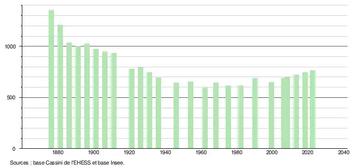 L'évolution du nombre d'habitants est connue à travers les recensements de la population effectués dans la commune depuis 1876. Pour les communes de moins de 10 000 habitants, une enquête de recensement portant sur toute la population est réalisée tous les cinq ans, les populations de référence des années intermédiaires étant quant à elles estimées par interpolation ou extrapolation[16]. Pour la commune, le premier recensement exhaustif entrant dans le cadre du nouveau dispositif a été réalisé en 2008[17].