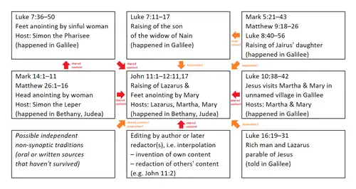 L'exégèse historico-critique moderne s'attache à établir de quelle façon la narration johannique de la résurrection de Lazare et de l’onction des pieds de Jésus par Marie de Béthanie (Jean 11:1-12 ; 11,17) a pu être composée et quelles sont ses relations avec les Évangiles synoptiques (Marc, Matthieu et Luc), qui lui sont antérieurs. L’auteur de Jean semble avoir emprunté plusieurs éléments à différentes histoires – sans rapport à l’origine – pour les combiner en un seul récit. Il s’agit notamment de l’onction de la tête de Jésus par la femme anonyme à Béthanie (Marc 14, Matthieu 26), de l’onction et de l’essuyage des pieds de Jésus en Galilée par la pécheresse (Luc 7) ; ces deux premiers peuvent avoir une origine commune, le récit de Luc étant probablement dérivé de Marc. Il s'agit également de la visite de Jésus à Marthe et Marie dans le village galiléen sans nom (Luc 10), de la parabole du riche et de Lazare (Luc 16 ), et peut-être d’autres qui évoquent des résurrection miraculeuses : celles de la fille de Jaïre et du fils de la veuve de Naïn. En parallèle, d’autres éléments ont été enlevés ou remplacés. Par exemple, Simon le Lépreux/Simon le Pharisien a été remplacé par Lazare dans le rôle de l'hôte de la fête donnée en l’honneur de Jésus, et la ville de Béthanie en Judée a été choisie pour cadre, tandis que l'essentiel du récit de Jean correspond à des traditions que les synoptiques ont situées en Galilée. En particulier, les deux premiers versets de Jean 11 suggèrent l'effort d’un rédacteur ultérieur pour souligner un lien entre ces histoires alors qu'il ne se trouve pas dans les manuscrits anciens des évangiles canoniques[4],[5],[6],[7].