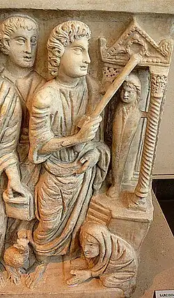 | Attributs | tombeau et bandelettes enroulées sur le corps |