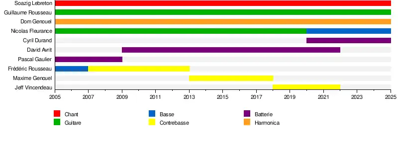 En 2024, le groupe se compose donc de Dominique Genouel (harmonica), Nicolas Fleurance (basse), Soazig Lebreton (chant), Guillaume Rousseau (guitare) et Cyril Durand (batterie).