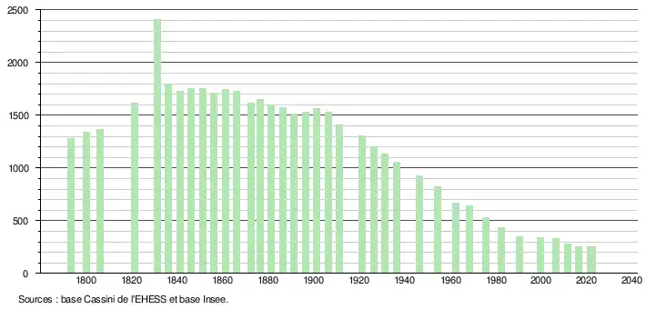 L'évolution du nombre d'habitants est connue à travers les recensements de la population effectués dans la commune depuis 1793. Pour les communes de moins de 10 000 habitants, une enquête de recensement portant sur toute la population est réalisée tous les cinq ans, les populations de référence des années intermédiaires étant quant à elles estimées par interpolation ou extrapolation[17]. Pour la commune, le premier recensement exhaustif entrant dans le cadre du nouveau dispositif a été réalisé en 2006[18].