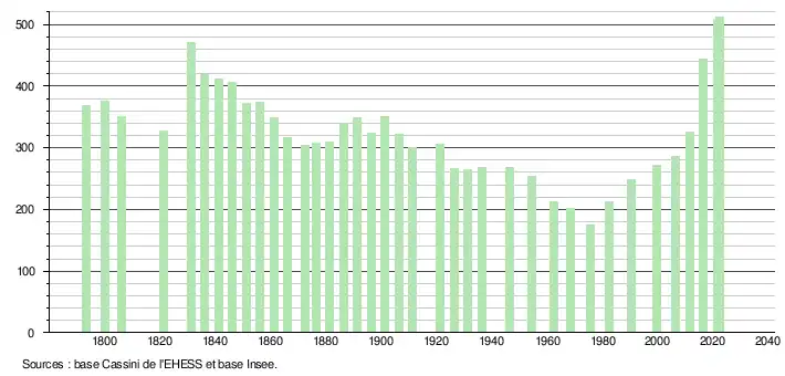 L'évolution du nombre d'habitants est connue à travers les recensements de la population effectués dans la commune depuis 1793. Pour les communes de moins de 10 000 habitants, une enquête de recensement portant sur toute la population est réalisée tous les cinq ans, les populations de référence des années intermédiaires étant quant à elles estimées par interpolation ou extrapolation[16]. Pour la commune, le premier recensement exhaustif entrant dans le cadre du nouveau dispositif a été réalisé en 2006[17].