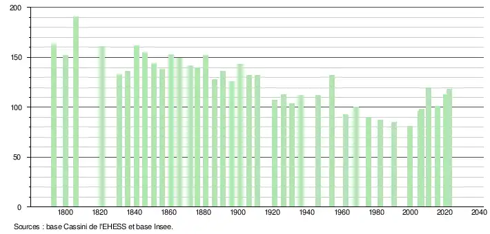 L'évolution du nombre d'habitants est connue à travers les recensements de la population effectués dans la commune depuis 1793. Pour les communes de moins de 10 000 habitants, une enquête de recensement portant sur toute la population est réalisée tous les cinq ans, les populations de référence des années intermédiaires étant quant à elles estimées par interpolation ou extrapolation[21]. Pour la commune, le premier recensement exhaustif entrant dans le cadre du nouveau dispositif a été réalisé en 2005[22].