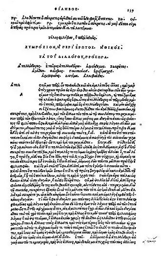 - ↑ Platon (trad. du grec par Luc Brisson), Le Banquet [« Συμπόσιον »], GF Flammarion (no 1327), , 6e éd. (1re éd. 1998), 290 p. (ISBN 978-2-0813-8264-0), p. 14 :