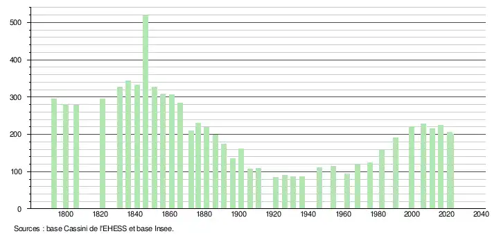 L'évolution du nombre d'habitants est connue à travers les recensements de la population effectués dans la commune depuis 1793. Pour les communes de moins de 10 000 habitants, une enquête de recensement portant sur toute la population est réalisée tous les cinq ans, les populations de référence des années intermédiaires étant quant à elles estimées par interpolation ou extrapolation[21]. Pour la commune, le premier recensement exhaustif entrant dans le cadre du nouveau dispositif a été réalisé en 2006[22].