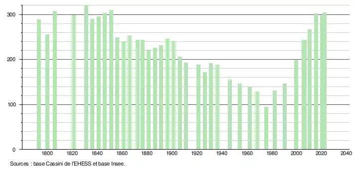 L'évolution du nombre d'habitants est connue à travers les recensements de la population effectués dans la commune depuis 1793. Pour les communes de moins de 10 000 habitants, une enquête de recensement portant sur toute la population est réalisée tous les cinq ans, les populations de référence des années intermédiaires étant quant à elles estimées par interpolation ou extrapolation[18]. Pour la commune, le premier recensement exhaustif entrant dans le cadre du nouveau dispositif a été réalisé en 2005[19].