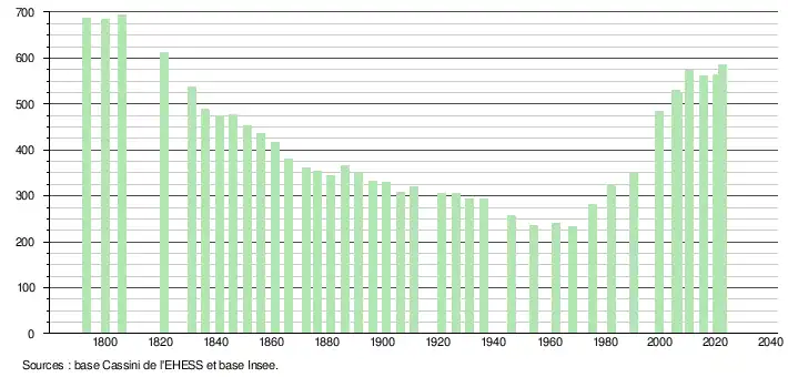 L'évolution du nombre d'habitants est connue à travers les recensements de la population effectués dans la commune depuis 1793. Pour les communes de moins de 10 000 habitants, une enquête de recensement portant sur toute la population est réalisée tous les cinq ans, les populations de référence des années intermédiaires étant quant à elles estimées par interpolation ou extrapolation[25]. Pour la commune, le premier recensement exhaustif entrant dans le cadre du nouveau dispositif a été réalisé en 2005[26].